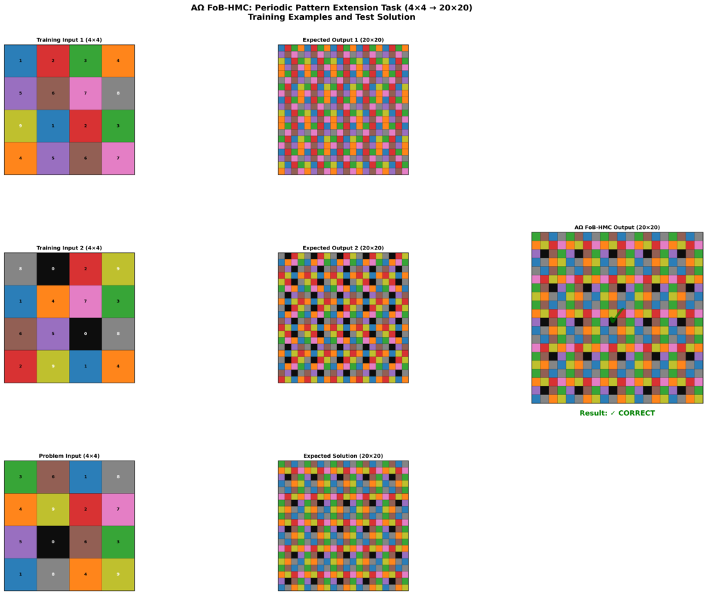 In enclosure tasks, interior and exterior are not labeled or computed procedurally. They emerge as the only stable configuration that satisfies boundary constraints. In periodic extension tasks, patterns are not memorized or extrapolated statistically. The underlying generator is inferred and enforced uniformly across scale. In all cases, solutions arise through convergence, not prediction.