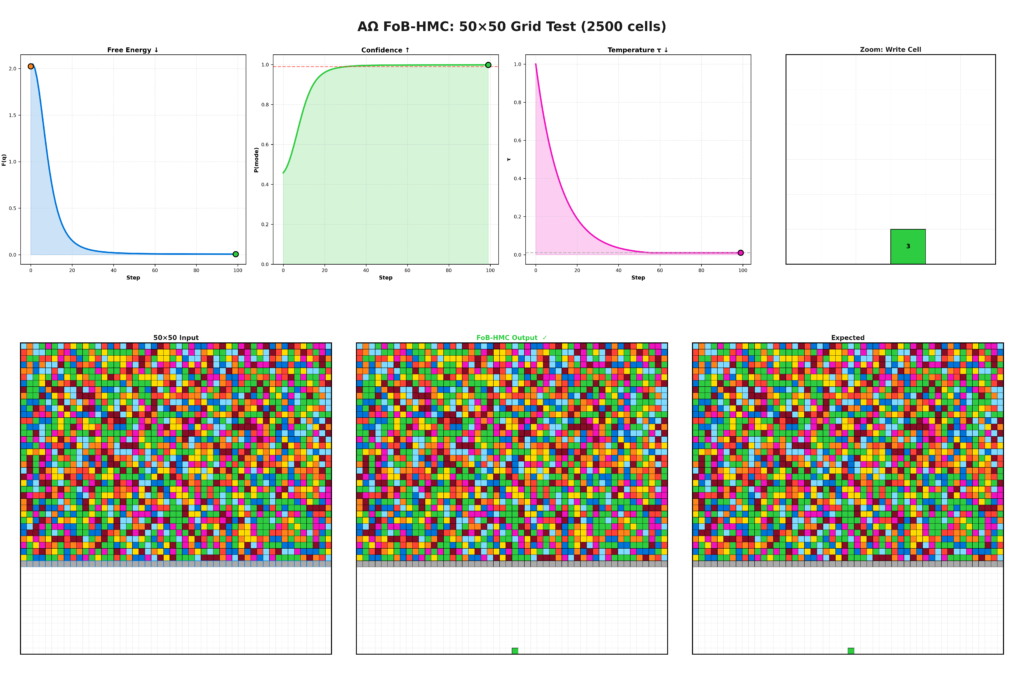 This inference process remains stable as tasks scale. Larger grids or more complex geometries do not push Seed IQ™ outside a learned distribution of solutions. The system continues to evaluate the problem as a whole, leaving solution possibilities open until structural consistency resolves them by collapsing onto the answer. Execution time remains predictable, and solution quality remains invariant as scale increases.