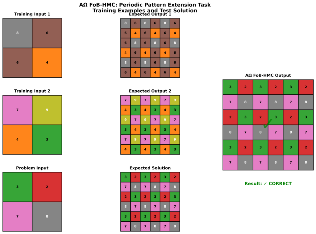 This ARC AGI task is a periodic pattern extension problem drawn directly from the dataset. The input is a 2×2 grid and the output is a 6×6 grid. The transformation requires tiling the input into a 3×3 layout while enforcing a row-wise alternating structural rule. The pattern is not simple repetition. Each row alternates between two structural phases derived from the original motif. Only two training examples are provided. There is no statistical distribution to learn from and no opportunity for memorization. The system must infer the underlying generative rule itself and apply it exactly to a novel input.