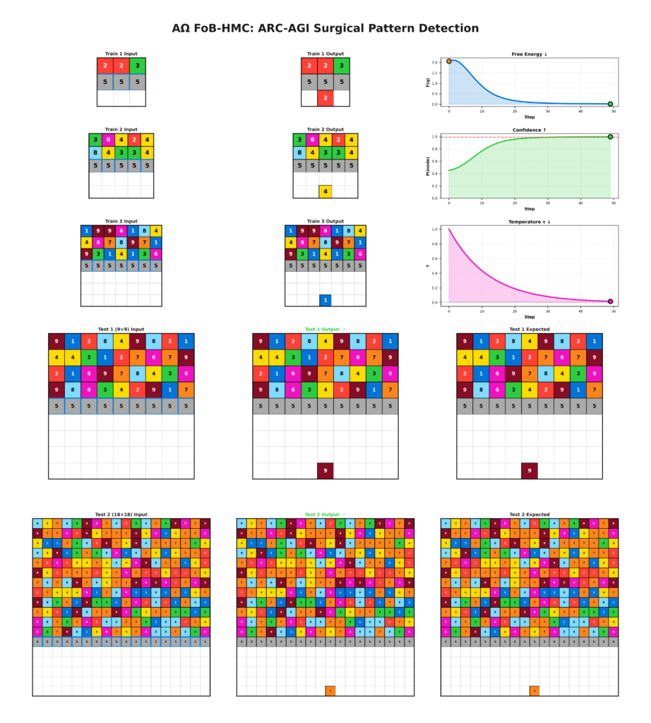 Seed IQ™ does none of these. It does not train on ARC tasks, enumerate rules, or search solution space. Each task is represented as a continuous belief field in which multiple structural hypotheses coexist. Inference proceeds through convergence toward a globally coherent configuration rather than stepwise execution of predefined operations.