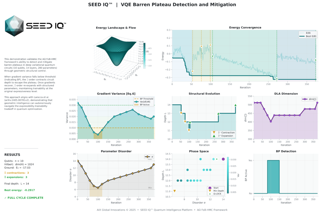 By making barren plateaus explicit, detectable, and actionable, Seed IQ™ changes how the quantum computing field can approach scale. Instead of treating circuit depth limits as fixed constraints that must be avoided in advance, circuit viability becomes something that can be monitored and managed during execution. This reduces wasted hardware runs, clarifies true scaling boundaries, and enables longer horizon quantum workflows on real devices.